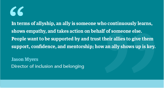 Myers continues: “And at some point in your life, no matter who you are and how you identify, you will need an ally. Although marginalized groups may be top of mind when you think about who may need an ally, there are also, for example, employees who are new to CHG who need an ally, or an individual who’s lost a loved one or received a tough medical diagnosis. Everyone needs an ally.”