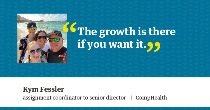 Over two decades ago, Kym joined CompHealth as an assignment coordinator but quickly realized she wanted more. “I knew pretty quickly that I wanted to do something different, so I pursued leadership.” With the support of her leader and learning and development courses along the way, Kym is now a senior director over CompHealth’s payroll and assignment coordinator teams.