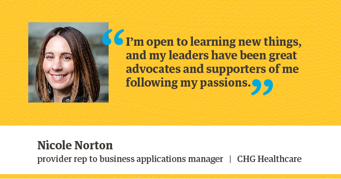 CHG supports training its people for promotions and leadership, and it supports them in moving around departments until they find the right fit. Nicole Norton is a perfect example. She started as a recruiter, even though she didn’t have a sales background. But she also had a background in training, so she quickly moved into a technical trainer role.