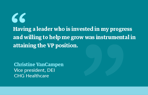 Christine VanCampen, VP of diversity, equity, and inclusion, says, "Having a leader who is invested in my progress and willing to help me grow was instrumental in my attainment of the VP position. My leader at CHG helped me understand my strengths and where I needed to refine my skills to get to the next level. I also took full advantage of leadership development tools, training, and resources offered at CHG."