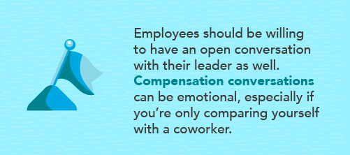 Employees should be willing to have an open conversation with their leader. Compensation conversations can be emotional, especially if you’re only comparing yourself with a coworker. It’s important to remember this is a business discussion. Opening the conversation with something like, “I’d like to better understand our pay philosophy. Given it’s been a hot employment market, do you feel my compensation is where it should be?” It’s also helpful to offer specific examples of how you have contributed to the team and the company.
