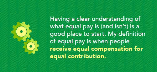 Having a clear understanding of what equal pay is (and isn’t) is a good place to start. My definition of equal pay is when people receive equal compensation for equal contributions.