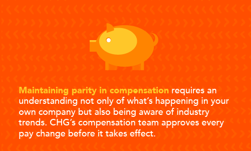 Maintaining parity in compensation requires an understanding not only of what’s happening in your own company but also being aware of industry trends. CHG’s compensation team approves every pay change before it takes effect. That gives the company an opportunity to audit compensation in real-time. These audits have helped us identify some important factors that can affect pay equity.