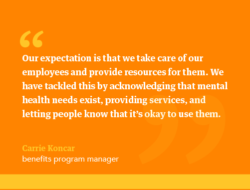 "Our expectation is that we take care of our employees and provide resources for them," says Carrie Koncar, CHG's benefits program manager. "We have tackled this by acknowledging that mental health needs exist, providing services, and letting people know that it's okay to use them."
