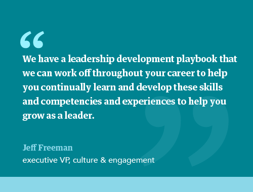 “We have a leadership development playbook that we can work off throughout your career to help you continually learn and develop these skills and competencies, and experiences to help you grow as a leader. Whether that’s grow in your existing role or grow in the organization,” he explains. “Instilling trust and developing talent are critical to leaders at all levels.”