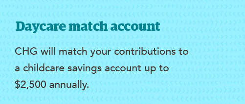 We offer a daycare match program that can help you offset the cost of childcare. CHG will match your contributions to a childcare savings account up to $2,500 annually.