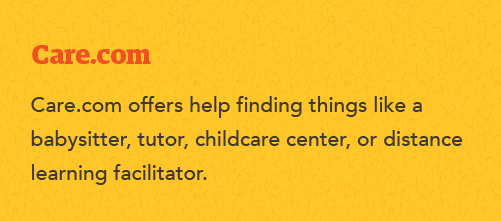 We provide premium access to Care.com, which ordinarily operates on a monthly subscription. As the world’s largest caretaker network, Care.com can help you find what your family needs, whether a nanny, a babysitter, a tutor, a distance learning facilitator, or a childcare center. We know how important it is for your children to be cared for when you can’t be there, so we’ve partnered with Care.com to make it easier for you.