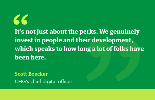 Another reason Boecker was drawn to CHG was the company culture centered around our core value of putting people first. “I immediately fell in love with the people, with the culture. The authenticity of the culture really spoke to me,” he commented. “It’s not just about the perks. We genuinely invest in people and their development, which speaks to how long a lot of folks have been here. This is not a place to work for two years; burn yourself out, take a break, and go do it somewhere else all over again. That is not what we’re looking for.”