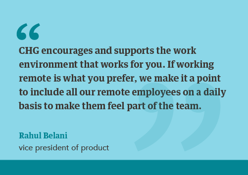 Rahul Belani, vice president of product, says CHG’s culture was one of the things that attracted him to CHG. “Personally, when I’m looking at an opportunity, I look at the environment I'm going to be joining more than the job that I’m going to be doing,” Belani says. “I look at the leadership team, the environment, the company culture, and so on. CHG clearly stands out when it comes to culture; it’s genuine.”