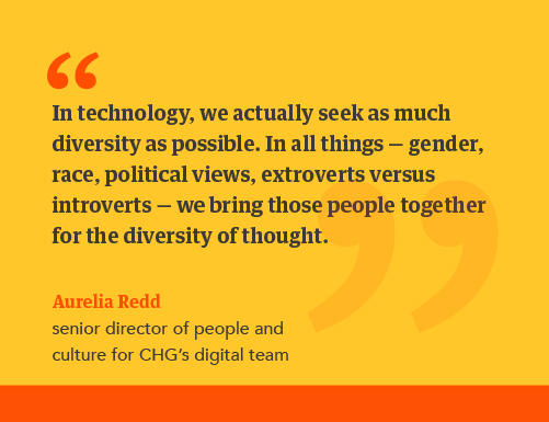Similarly, bringing together people of different backgrounds and schools of thought is imperative to creating the best product possible. Aurelia Redd, senior director of people and culture for CHG’s digital team, tells us, “If we fill a room with people and every person thinks the same, acts the same, and talks the same, we're not going to challenge ourselves to create a better solution.”