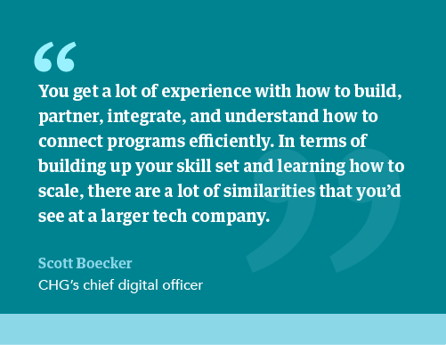 CHG’s chief growth officer, Scott Boecker, says that a tech job at CHG involves solving unique and complex problems. He notes, “We’re not just designing a single product; multiple products are touched through the journey of a provider being placed at a hospital. If, career-wise, you’d like to be at the juncture where people and technology together are solving a big problem, we are absolutely the place to be.”