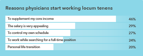 Our 2024 State of Locum Tenens Report revealed that for half of the respondents (46%), physicians chose to work locum tenens primarily to supplement their core income, while 29% chose to work locums because the salary was appealing. Other reasons include more control over their schedule and to fill a career gap while searching for a job or transitioning to retirement.