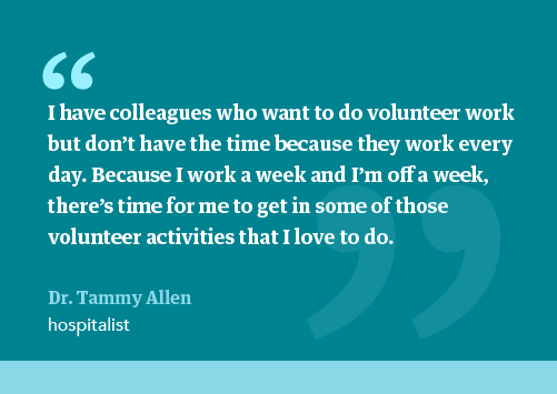“I have colleagues who want to do volunteer work but they literally don’t have the time because they work every day. Because I work a week and I’m off a week, there’s time for me to get in some of those volunteer activities that I love to do,” Allen says.