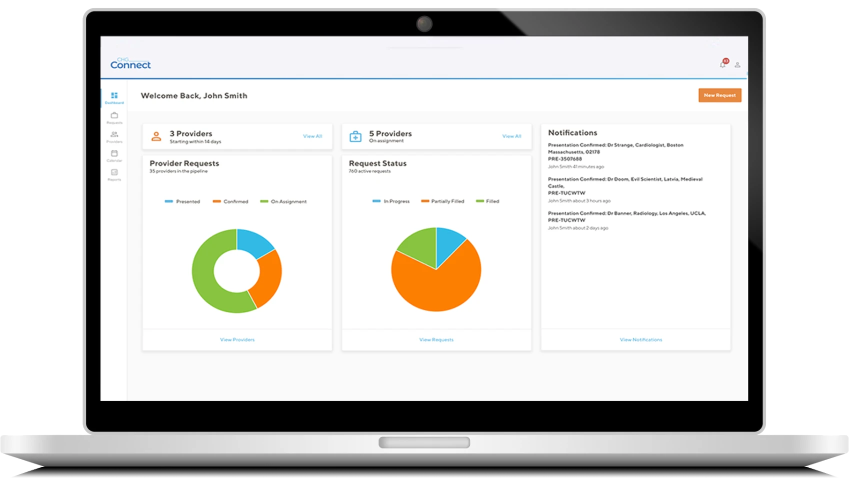 Designed to help providers find job opportunities, get credentialed, and prepare for travel so they can feel confident before their assignments. Once a provider is on assignment, our powerful mobile apps simplify the locums experience with seamless time entry, timely reminders/alerts, travel details, and more!